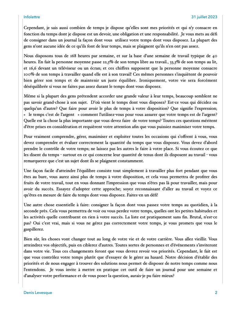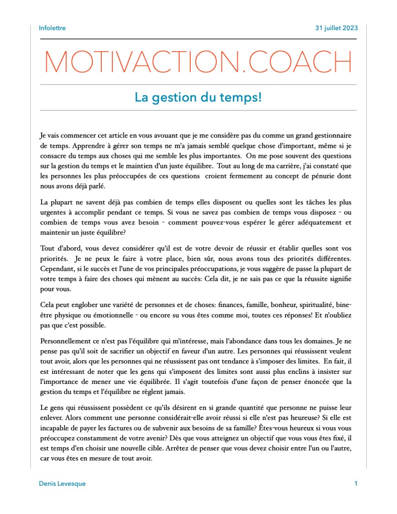 La gestion du temps Publié parDenis Lévesque31 juillet 2023Publié dansNon classé En savoir plus sur Motivaction.coach Abonnez-vous pour recevoir les derniers articles par e-mail. Saisissez votre adresse e-mail… Abonnez-vous Partager : Cliquer pour partager sur X(ouvre dans une nouvelle fenêtre) X Cliquez pour partager sur Facebook(ouvre dans une nouvelle fenêtre) Facebook J’aime chargement… Similaire